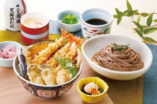 瀬戸内産の牡蠣、たら白子の天ぷらに、海老天を3尾盛り付けた豪華な天丼です。たら白子ボン酢の小鉢と茶碗蒸し、そば/うどんがセットです。