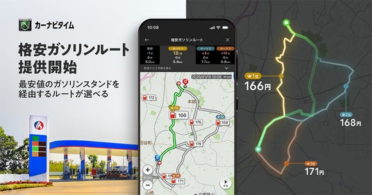 株式会社ナビタイムジャパン(代表取締役社長:大西 啓介、本社:東京都港区)は、2025年1月16日(木)より、カーナビアプリ『カーナビタイム』にて出発地から目的地までの周辺のガソリン価格を考慮し、価格の安いガソリンスタンド※1を経由地としたルートを検索できる「格安ガソリンルート」検索機能を提供開始いたします。