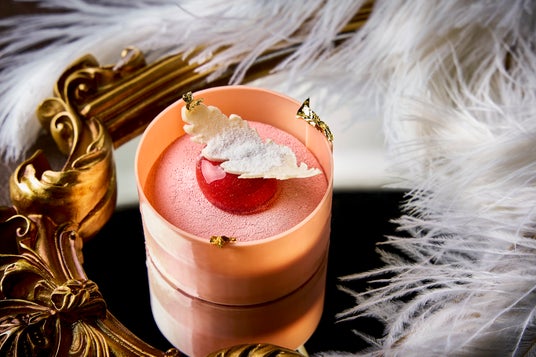 可愛らしいピンクのムースをベルベッドのリボンで包みこんだかのような華やかなルックスのスイーツ。アーモンドサブレの上にアーモンドスポンジとブラックベリーティーチョコレートを重ね、その上にブラックベリーティームースをまとわせた贅沢な味わいです。甘酸っぱいストロベリージュレの上に神秘的かつ優雅な天使の羽を象ったホワイトチョコレートをあしらいました。