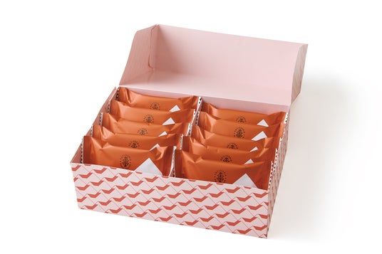 国立市の象徴である赤い駅舎をモチーフに、梅林堂とゆかりのあるイラストレーター奥村ゆいによって特別に制作されたデザイン。両社の縁と地域への想いを体現しています。