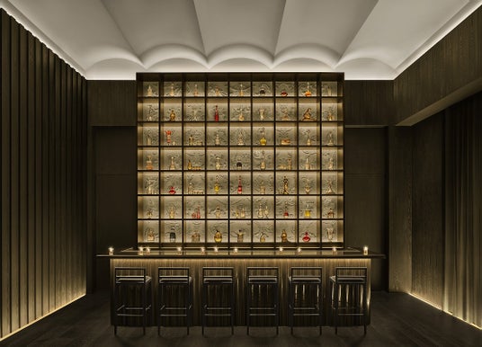 黒を基調に白とゴールドが巧みに配されたこの空間は、ジュエリーの希少素材から着想を得て、また日本の伝統的な工法で、耐久性を増すための「焼杉」からインスパイアされた黒塗りの木材仕上げになっています。