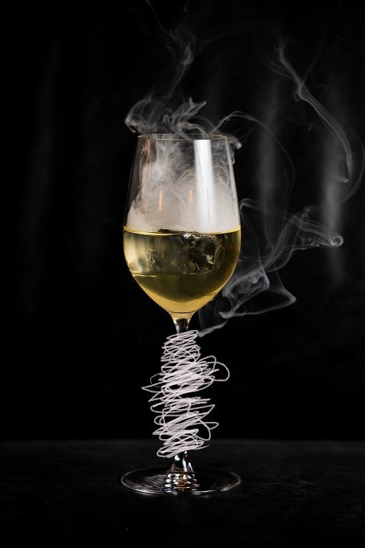 パロサントという香木とトンカビーンに麦焼酎を組み合わせ、バナナを使用せずにバナナの香りを再現したワインのように飲むカクテル。バニラの霧を纏わせて提供。
