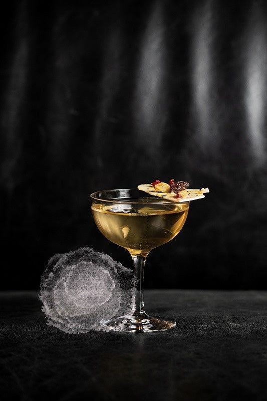 ナチュラルワイン店がひしめく奥渋をイメージし、クラシックカクテルのFrench75をツイストさせたボトルドカクテル。オレンジワインとジンにVerjusという葡萄ジュース、フルーツブランデーを混ぜ、柚子とドライフルーツのチョコレートを添えました。