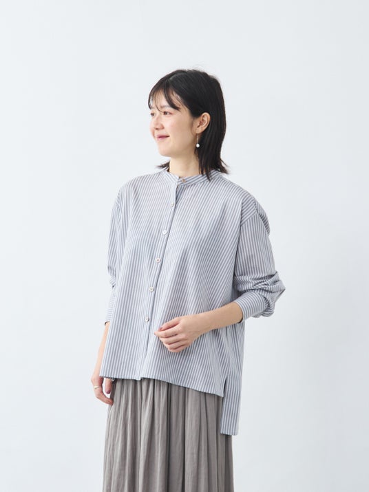 「以前バランサーキュラーのワンピースを購入していて、その柔らかで丈夫な素材感と何とも可愛いストライプ感に惚れ込んだためシャツも即決で購入。ワンピース同様、とにかく着心地がよく安心感がある素材感で、愛らしいグレーの色味で辛めにも甘めにも合わせられるテイスト感が秀逸だと感じているため。」(M.N.様)
