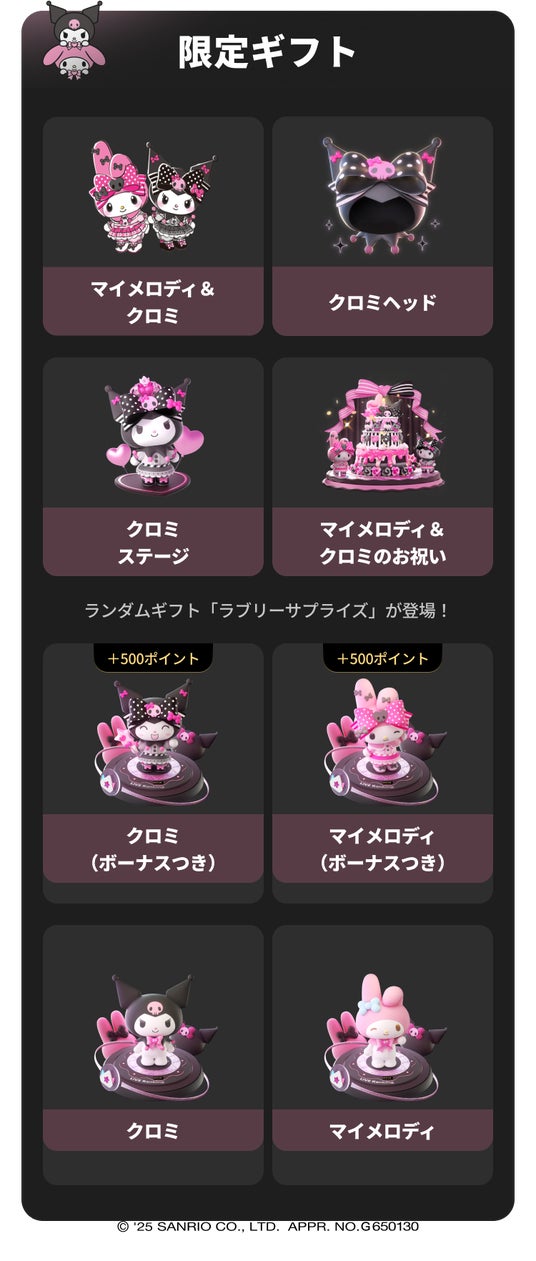 イベント期間中に『マイメロディ50周年&クロミ20周年記念』との限定ギフトが5種類リリースされます。