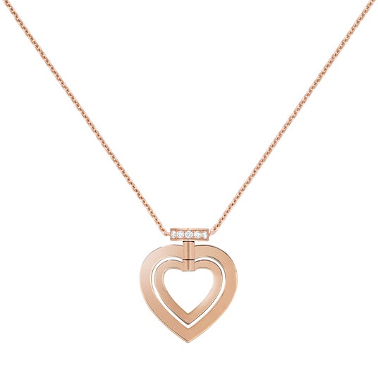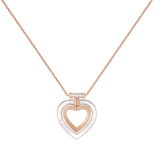 新しいサイズで登場したプリティウーマン イプノティックネックレスは、2つの可動式ハートが、ダイヤモンドとゴー ルドのパヴェクラスプで結ばれています。ひとつはマザーオブパール、もうひとつはダイヤモンドのパヴェ。どちらの ハートもリバーシブルで、裏面にはピンクゴールドがあしらわれ、4 通りの組み合わせが可能。
