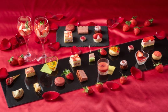 苺を中心とした15種類のスイーツが勢ぞろい。サクサクのタルトにジューシーな苺をのせた「苺のタルト」、しっとりとしたスポンジ生地に可愛らしいお花をトッピングした「苺のショートケーキ」、ふんわりとした「苺のバウムクーヘン」、フランス産発酵バターを使用した「苺のカヌレ」、ハート型の器に入った可愛らしい「苺のソースとココナッツのブランマンジェ」など、多彩な味わいをお楽しみいただけます。また、フレーバーブラスターで香り豊かなバブルを添えた「苺と薔薇香るパフェ」は、見た目にも味わいにも特別感を演出します。