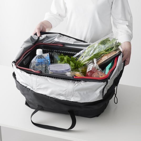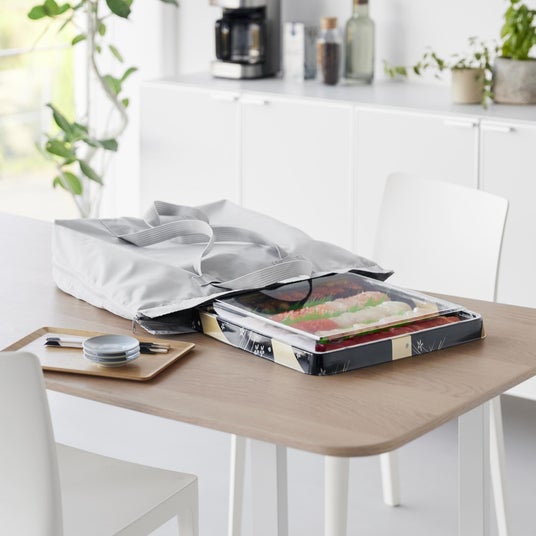 傾けたくない持ち帰り寿司やピザも入ってフレキシブルに変化する洗える保冷保温のエコバッグ。