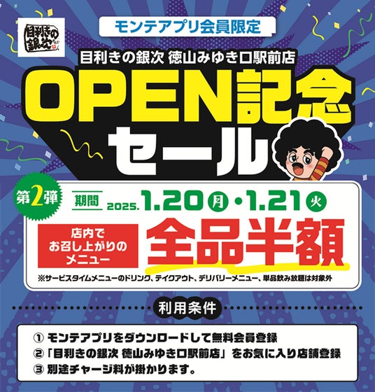 オープン1か月を記念し、第2弾のオープン記念セール<2025年1月20日(月)、21日(火)の2日間に限り、店内でお召し上がりのメニュー全品半額>を開催します。
