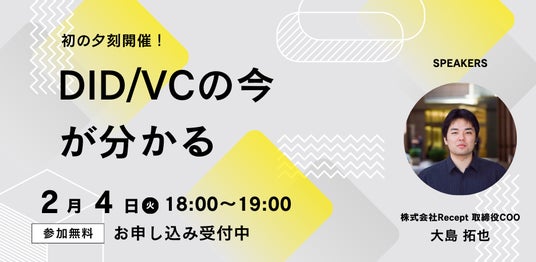 今回も、DID/VC領域のリーディングカンパニーである株式会社ReceptでCOOを務める大島が登壇し、DID/VCの最新動向や具体的なユースケース、ビジネス化を検討する上での論点を紹介します。