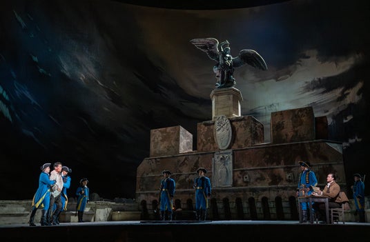 古典オペラの中でも特に人気の高いプッチーニの名作で、〈星は光りぬ〉〈歌に生き、恋に生き〉などの名曲が彩るドラマティックな愛憎劇です。ローマの史跡をモデルにした緻密で豪華な舞台装置を用いたデイヴィット・マクヴィカーの荘厳な演出と、ドラマを引き立てるMET音楽監督ヤニック・ネゼ=セガンの指揮で、1800年のローマへと誘います。