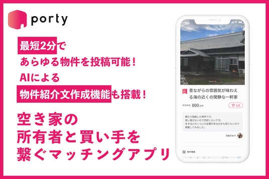 株式会社ポルティ(神奈川県川崎市、代表取締役:平瑶平、以下「ポルティ」)は、昨年12月に発表した空き家の所有者と買い手を繋ぐマッチングアプリ「ポルティ」の正式リリースを記念して、アプリ内での物件投稿や物件売却、アプリの紹介へ特典を付与する「総額1億円!物件投稿で2万円をもらおうキャンペーン!」を1月20日より開始します。