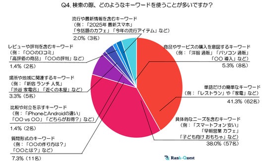 最も多かった回答は「単語だけのシンプルなキーワード」で41.3%を占めました。30代は仕事や家庭の用事などで忙しく、短いキーワードで素早く情報を得たいという意向が強いことがうかがえます。