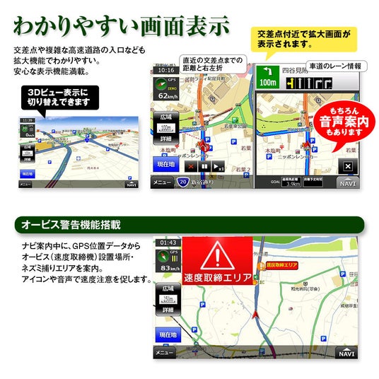 速度取締エリア・Nシステム・オービスの3種類の取り締まりゾーン収録情報をもとに、警告して運転をサポートします。警告のON/OFF切り替え可能。