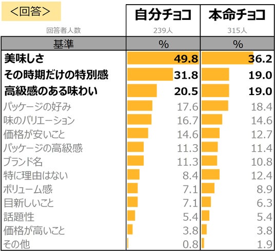 自分用チョコや本命チョコでは、「美味しさ」に続き、「その時だけの特別感」や「高級感のある味わい」が非常に重要な基準となっています。