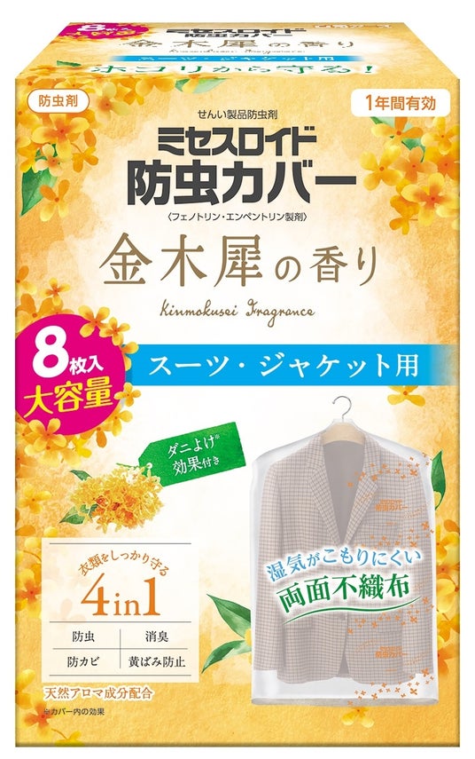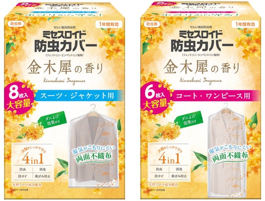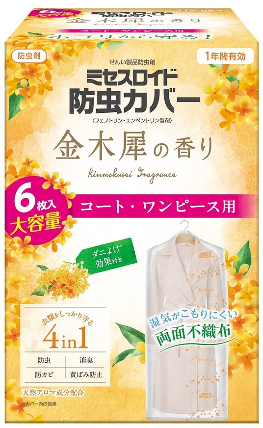 カバータイプの衣類用防虫剤「ミセスロイド防虫カバー」は、大切な衣類を虫食いやホコリから守る商品です。「防虫」「消臭」「防カビ」「黄ばみ防止」の4つの機能と「カバー内のダニよけ効果※」を搭載した多機能タイプとなっています。さらに、カバー両面に通気性の高い不織布を採用し、使用中に湿気がこもりにくくなっています。また、昨年秋に発売した『ミセスロイド防虫カバー 金木犀の香り』は、ミセスロイド防虫カバーの商品特長はそのままに、道端でふわっと香る、甘くて心地よい金木犀の香りが衣類をやさしく包む仕様で、多くの方からご支持いただき市場の活性化にも貢献しました。