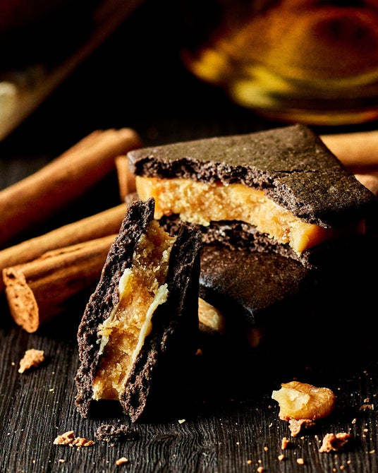 【サンド・オ・キャラメル】なめらかなくちどけの生感覚のキャラメルに砕いたくるみを合わせ、香ばしいココア風味のサブレでサンドしました。年齢問わず楽しむことができ、ご自宅用、ご贈答用として幅広くお買い求めいただけます。バレンタインにおすすめの一品。