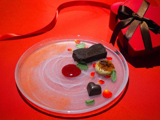 バレンタインに欠かせないのが甘いチョコレート。今回は、濃厚なチョコテリーヌと可愛いハートのフランボワーズのボンボンショコラ、バナナカタラーナをワンプレートで楽しめるドルチェプレートをご用意しました。付け合わせのフランボワーズソースやストロベリーパウダーをつけると程よい酸味がアクセントとなり、甘いものが苦手な方でもお楽しみいただける一皿です。