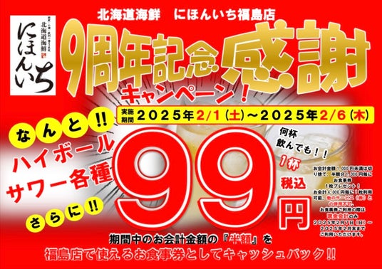 このたび、株式会社N・I(エヌアイ、本社:大阪府大阪市淀川区、代表取締役:河村 則夫)の運営する『北海道海鮮にほんいち』の福島店では2025年2月でオープン9周年を迎えます。これを記念して、「還元キャンペーン」を実施いたします。2025年2月1日(土)から2025年2月6日(木)までの期間中、サワー・ハイボール各種を何杯飲んでも、1杯 99円(税込)でご提供いたします。