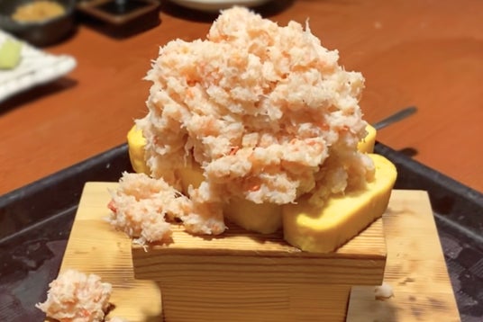 かにぶっかけ出巻玉子 価格:1,099円(税込)脅威の注文率(90%以上!)を誇る当店の超名物の商品で、「よいしょ!」の掛け声とともに赤字覚悟でどんどんかにをかけ続けます。