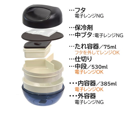内容器、中段は電子レンジOK。電子レンジがある環境であれば温かいランチを楽しめます。