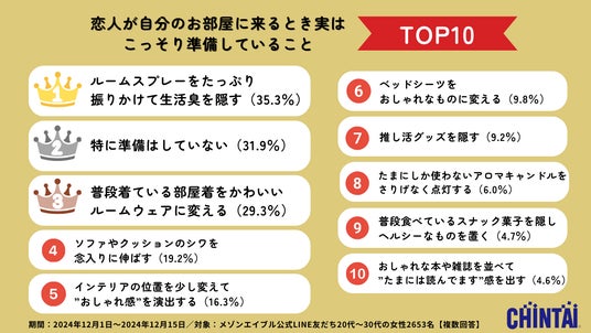 ・恋人がお部屋に来る前に行う準備として最も多かったのは、「ルームスプレーをたっぷり振りかけて生活臭を隠す」で35.3%でした。