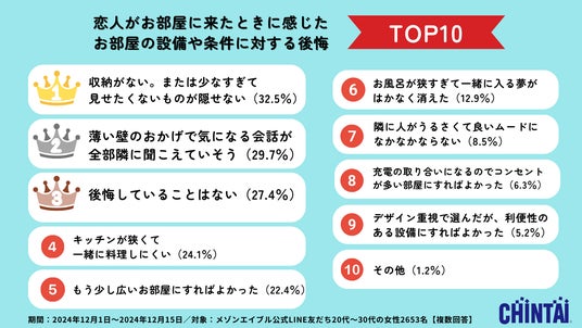 さらに、恋人との時間を通じて見えてくるお部屋の設備面への後悔も明らかになりました。「収納がない、または少なすぎて見せたくないものが隠せない」や「壁が薄く、気になる会話が隣に聞こえてしまいそう」といった回答が上位に挙がり、恋人との時間を快適で安心できるものにするために、収納力や防音性といった物理的な条件が欠かせないことが示されています。