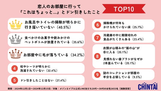 ・恋人のお部屋を訪れた際に最もドン引きすることは、「お風呂やトイレの掃除が明らかに行き届いていない」が40.5%を占めました。