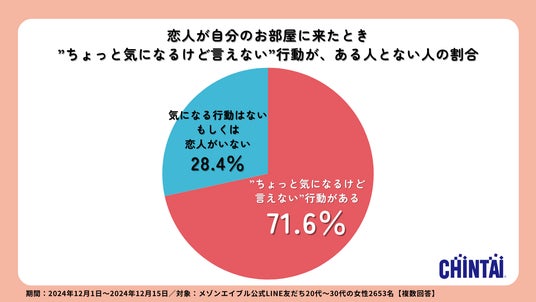 恋人が自分のお部屋に来たとき、71.6%の女性が恋人に対して“ちょっと気になるけど言えない行動”があると感じていることが判明しました。