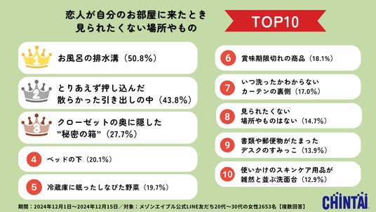 女性が恋人に見られたくない場所として最も多く挙げられたのは、「お風呂の排水溝」(50.8%)でした。また、「とりあえず押し込んだ散らかった引き出し」(43.8%)や「クローゼットの奥に隠した“秘密の箱”」(27.7%)といった、プライバシーや生活感が強く出る場所も上位に挙げられています。さらに、「ベッドの下」(20.1%)や「冷蔵庫に眠ったしなびた野菜」(19.7%)など、普段の掃除や整理整頓が行き届きにくい場所にも注意が向けられていることがうかがえます。