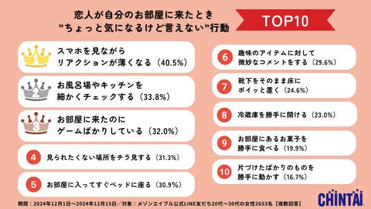 ・恋人が自分のお部屋に来たとき、“ちょっと気になるけど言えない行動”があると、女性の7割が回答しました。
