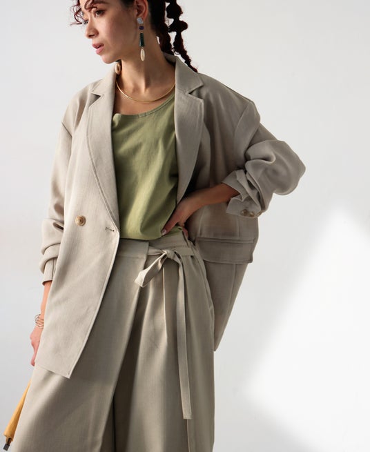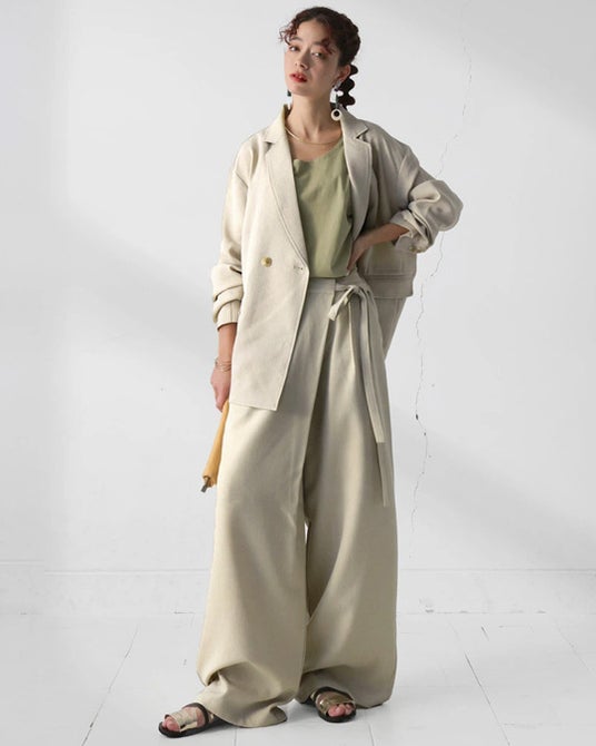 大人の余裕を纏う『ダブルジャケット×ワイドパンツセットアップ』落ち感生地が動くたびに美しく揺れる、高級感のあるセットアップ。オンオフ問わずお洒落を楽しめる、レディな抜け感を演出できるアイテム!