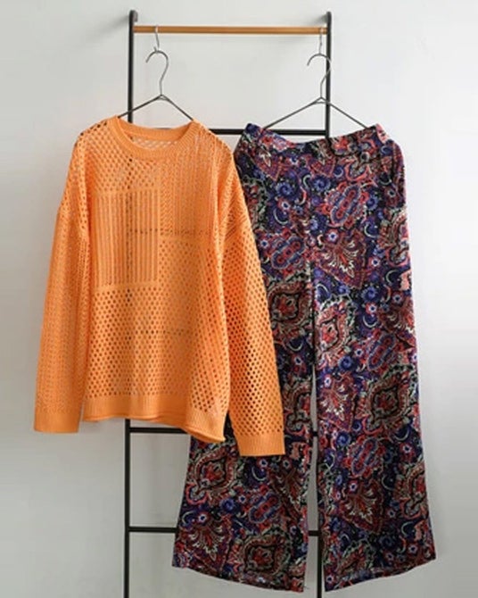 お洒落が楽しくなる『透かし編みニット×ペイズリー柄パンツ』