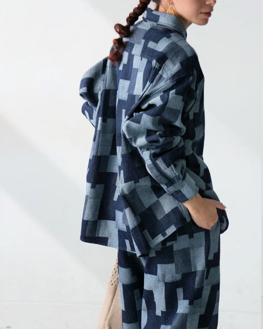 幾何学模様で魅せる『デニムジャケット×デニムパンツ』