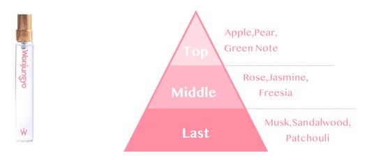 「スパークリングペアー」は、泡が弾けるシャンパンにみずみずしく甘い洋梨を加えたような、心躍るフルーティーな香り。フレッシュなローズの香りがアクセントとなり、凛とした雰囲気を放ちます。
