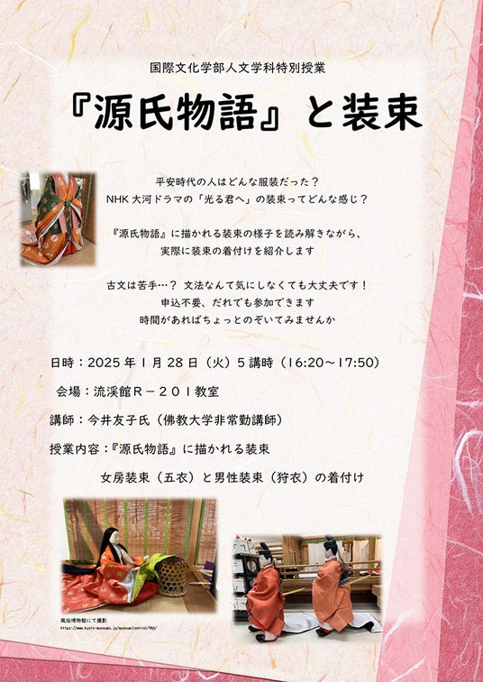 京都精華大学(京都市左京区、学長:澤田昌人)国際文化学部人文学科では、2025年1月28日(火)5講時(16:20~17:50)に、特別授業「『源氏物語』と装束」を開催いたします。