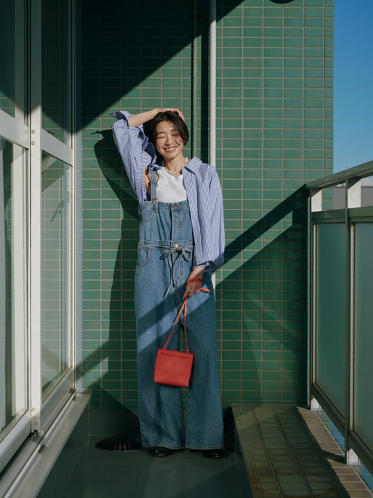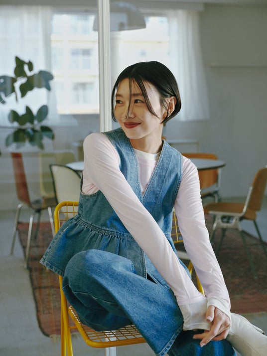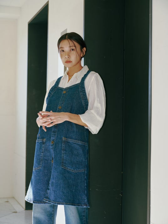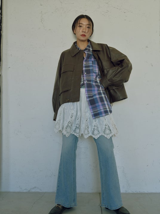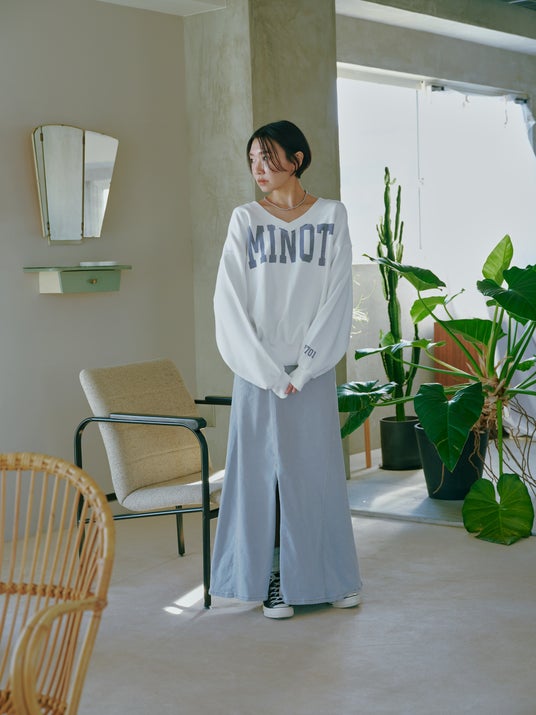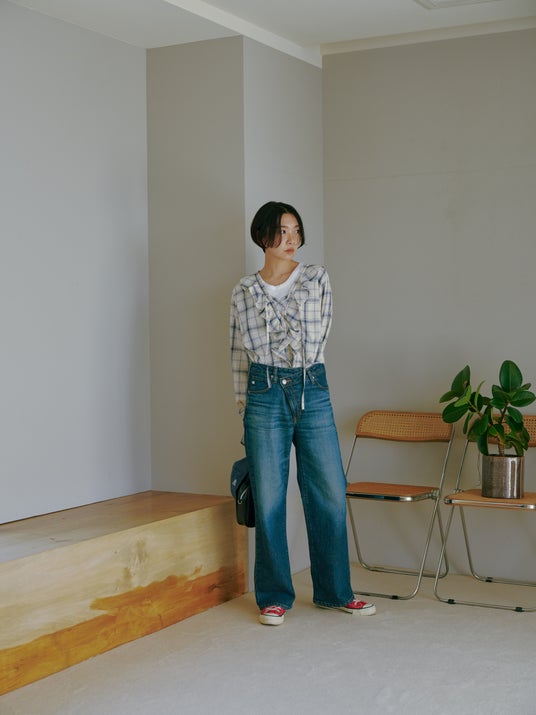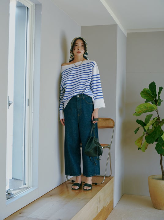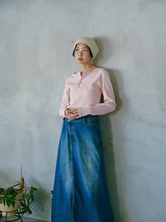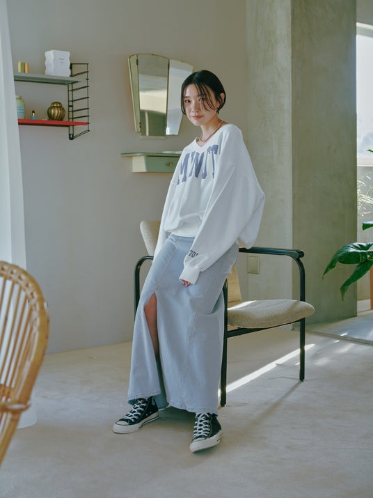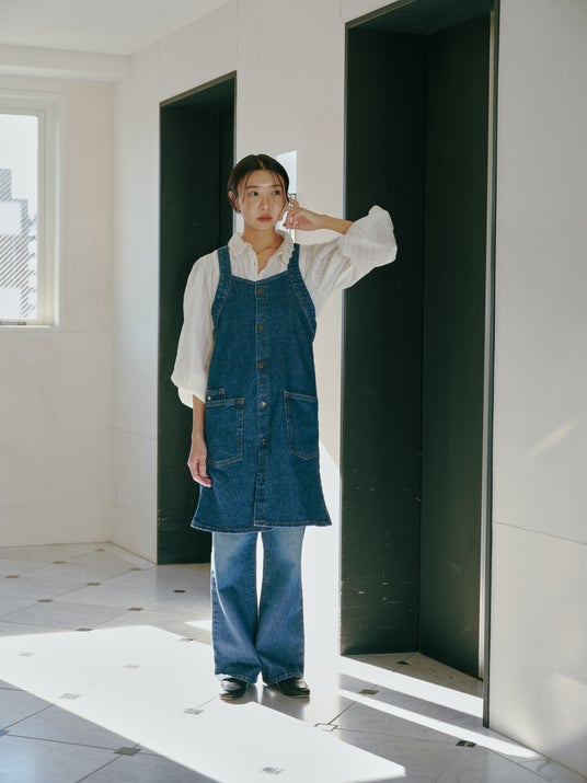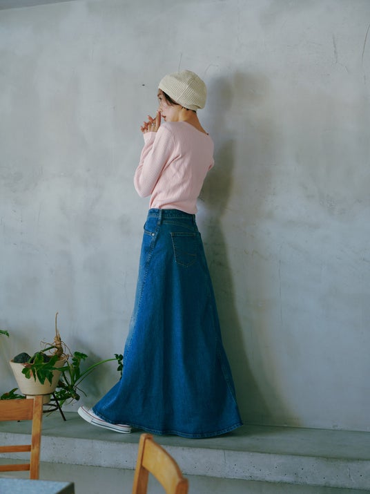カジュアルでヴィンテージライクな雰囲気がありながらも、フレアシルエットとスリットが女性らしさを演出。見た目よりも軽量で柔らかい弱ストレッチデニム。