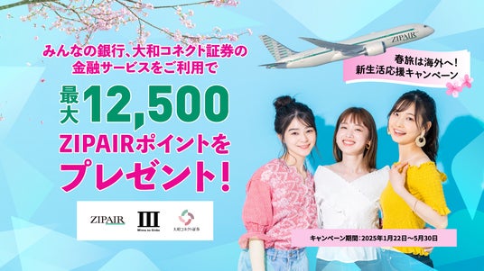 大和コネクト証券株式会社(本社:東京都中央区、代表取締役社長:大槻 竜児、以下「大和コネクト証券」)と株式会社ZIPAIR Tokyo(代表取締役社長 西田 真吾、以下「ZIPAIR」)、株式会社みんなの銀行(取締役頭取 永吉 健一、以下「みんなの銀行」)は、2025年1月22日から5月30日の間、条件達成で最大12,500ZIPAIRポイント*¹と最大3,000円相当の特典がもらえる「春旅は海外へ!新生活応援キャンペーン」を実施します。