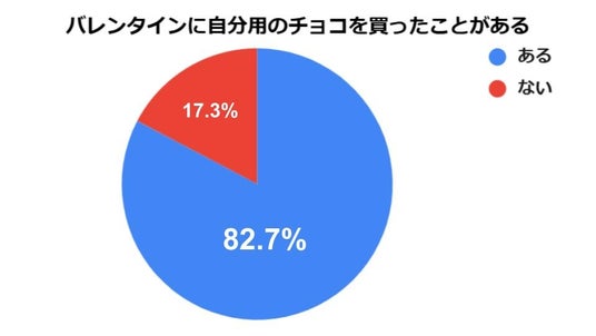 過去、バレンタインに自分用のチョコを買ったことがあるか聞いたところ、82.7%が「ある」と回答しました。かつてバレンタインはチョコレートを恋人やパートナー、お世話になった方などに贈るプレゼントとして購入するものというのが一般的でしたが、昨今では自分用に購入するのが一般的になってきていると考えられます。