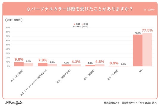 未婚・既婚別で見ると、大きな差はないという結果になりました。未婚・既婚にかかわらず、ライフステージの状況に応じて診断を受けているようです。自身の時間・お金を比較的自由に使える未婚者では、「パーソナルカラー専門サロン」での診断が多くなりました。一方、「美容院」で受けたという方は既婚者がわずかに多くなっています。家事や育児などとの両立で時間的制約がある中でも、美容院を訪れた際に併せて診断をしてもらうことで、効率的に自己投資の時間を確保していることが推察されました。