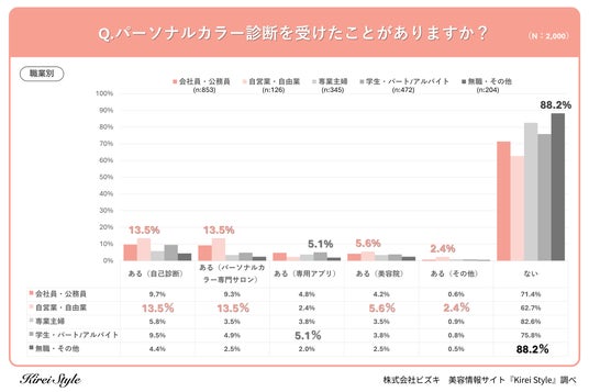 職業別で見ると、診断を受けたことがある方は「自営業・自由業」の方に最も多くなり、37.3%となりました。自営業・自由業の方の場合、自己イメージが仕事に直結する可能性が高く、自身のブランディングや顧客へのイメージアップの一環としてパーソナルカラーを活用していることが推察されました。特に、ある程度の費用がかかる「パーソナルカラー専用サロン」で診断を受けたという回答が他の職業と差をつけており、自己投資に積極的であることが伺えました。