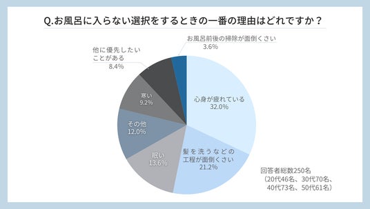 お風呂に入らない選択をする一番の理由として、もっとも多かった回答は、「心身が疲れている」(32.0%)でした。