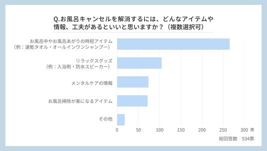 調査で「お風呂キャンセルを解消するには、どんなアイテムや情報、工夫があるといいと思いますか?」と尋ねたところ、もっとも多かった回答は「お風呂中やお風呂あがりの時短アイテム」(265票)でした。