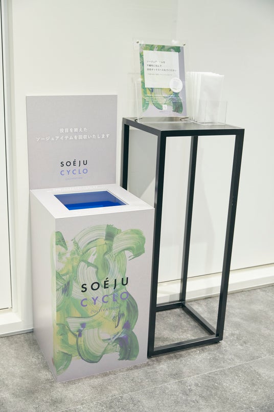 「SOEJU」では、ファッションで得られた価値を社会還元する取り組み「「SOEJU CYCLO(ソージュシクロ)」と連携し、ライフスタイルや体型・好みの変化などにより役目を終えた「SOEJU」製品を回収するアップサイクルプロジェクト「SOEJU CYCLO CULTIVATION 」を POP UP STORE など開催時に期間限定で展開してまいりましたが、このたび「SOEJUFitting Room」1 周年を機に「SOEJU CYCLO CULTIVATION 」を常設展開し、「SOEJU Fitting Room」に回収ボックスを設置いたします。