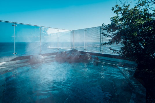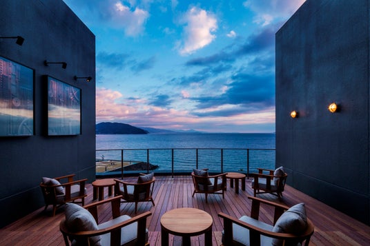 英国人航海士・三浦按針ゆかりの地、静岡県伊東市に位置する全室オーシャンビューの宿。館内随所に海や船旅をテーマにしたデザインが配されたモダンな空間が特徴です。船の甲板をイメージした湯上がり処「サンブエナデッキ」では海風を感じられます。