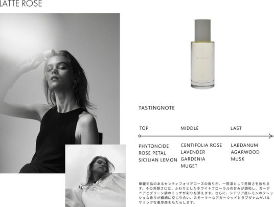 センティフォリアローズが奏でる上品なフローラルノートに、ミュゲやホワイトフローラルのニュアンスが重なります。
