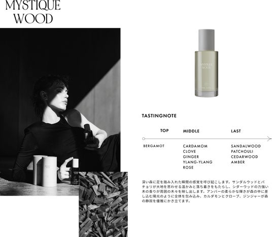 森の奥深くへと誘うような、ウッディノートが広がる香り。