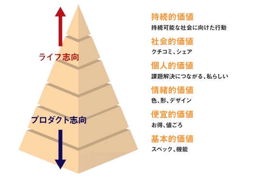 女性消費者は、商品において優先することが変わるだけでなくクラスターでも価値観が異なることがわかりました。この購買行動を理解するには、「6つの価値」を軸とした多面的な視点にあります。商品の土台となる基本的価値から順に持続的価値まで「6つの価値」を自社商品・サービスが満たしているのかを分析することが、女性市場の可能性を広げる第一歩になります。