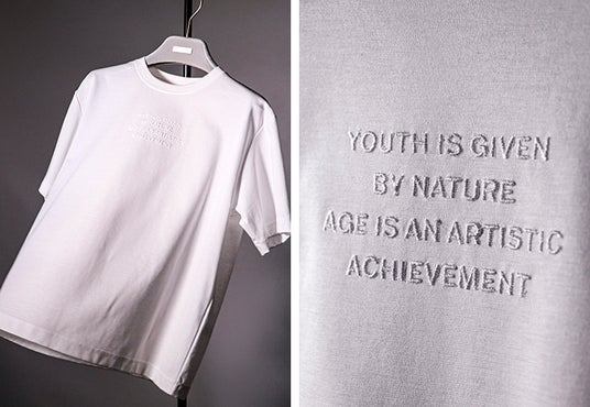 このカプセルコレクションはアーティスト・末松亜斗夢氏のクリエイティブディレクションのもと、「Youth is given by nature, age is an artistic achievement(若さは自然から与えられ、年齢は芸術的な成果である)」というメッセージをシンプルなTシャツに裏面刺繍で施した印象的なデザインが特徴です。刺繍デザインにはポーラ・シェアが愛用する芸術的フォントが採用され、そのメッセージを裏面刺繍の技法で表現することにより、立体的な質感と独特の陰影が生まれ、視覚的に印象的な効果をもたらします。