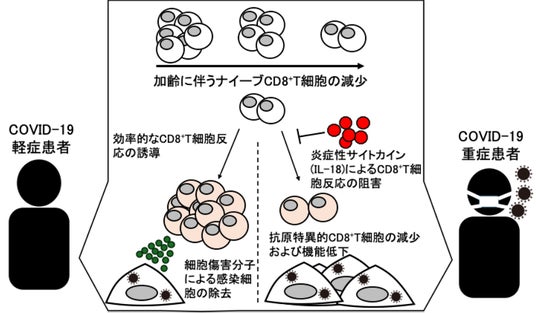 ⇒高齢者では、ナイーブCD8+ T細胞は、加齢とともにその数が減少し、機能も低下することが知られています。そのため、急性COVID-19のような強い炎症反応を伴う感染症においては、IL-18等の炎症性サイトカインの作用と相まって、感染細胞の除去に関わる抗原特異的CD8+ T細胞が誘導されにくくなっていることが、高齢者が重症化しやすい理由だと考えられます。